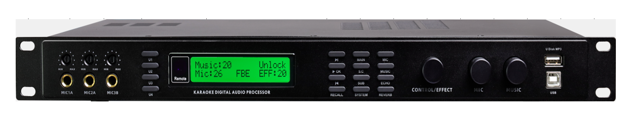 - Núm bấm chuyển chế độ, tùy chỉnh kết hợp chức năng tích hợp trực tiếp trên thiết bị: Chạy đến bài tiếp theo (Next), Tạm dừng/Ok/Chạy, Tua lại bài trước đó, Recall, Main, S.C, SUB, System, Mic, Music, Echo, ReverB.